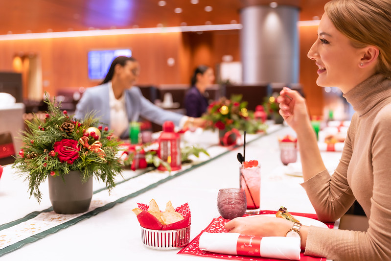 Qatar Airways has also created festive touches throughout the Al Mourjan Business Lounge at Hamad International Airport (HIA) for the very first time. Passengers can delight in the seasonal décor reflected in the flower arrangements, and holiday gift-box displays and feast on an assortment of holiday delicacies from the buffet or select from the special digital à la carte menu. For those passengers wanting to embrace the spirit of the season, a large communal table with stunning decorations including holiday inspired place mats, bread liners, napkin bands and table décor will bring people together to share a meal which amongst many choices can include  waldorf salad, stuffed turkey roulade, beef Wellington, yule log, gourmet hot chocolate with toasted marshmallows, signature mocktails and more.